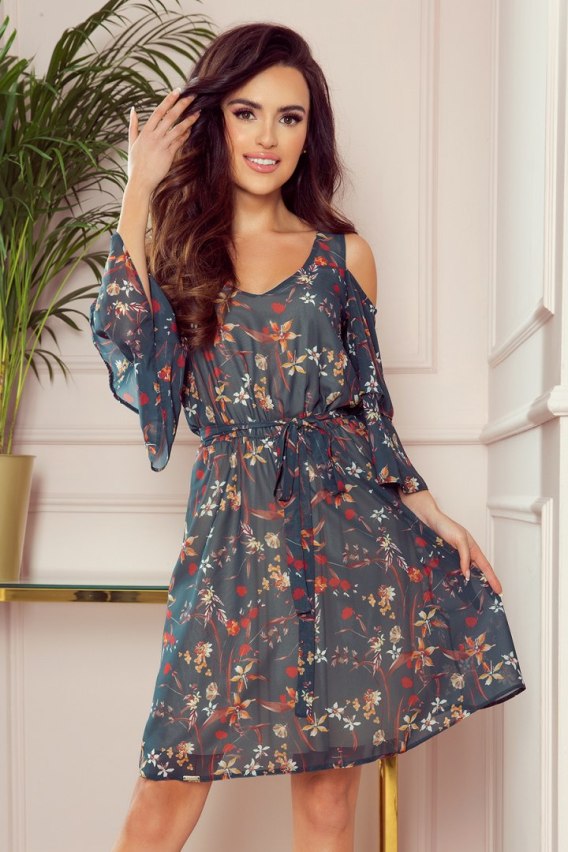 292-2 MARINA zwiewna sukienka z dekoltem - ZIELONA W KWIATY