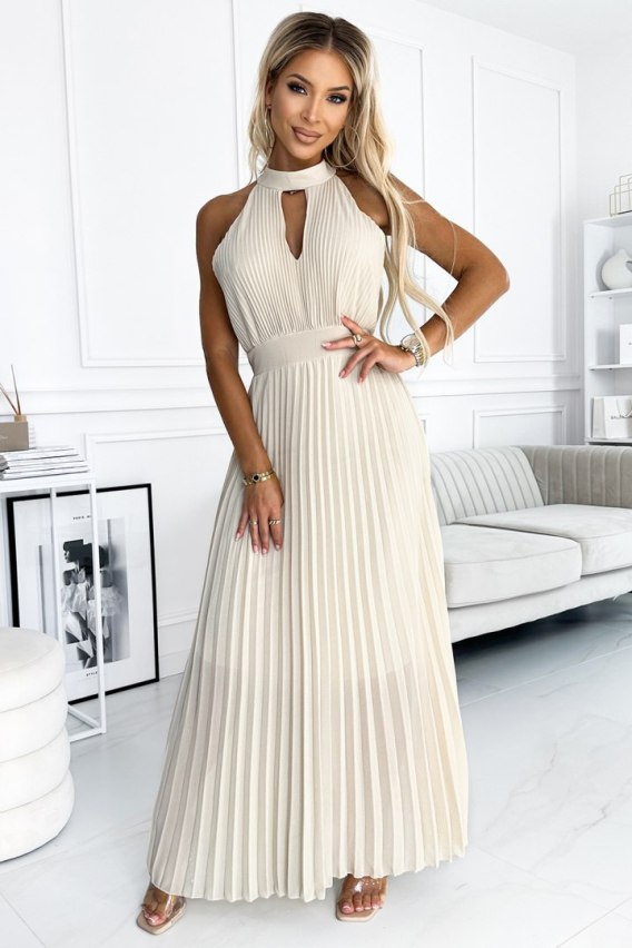 Plisowana sukienka z głębokim wycięciem na plecach - beżowa