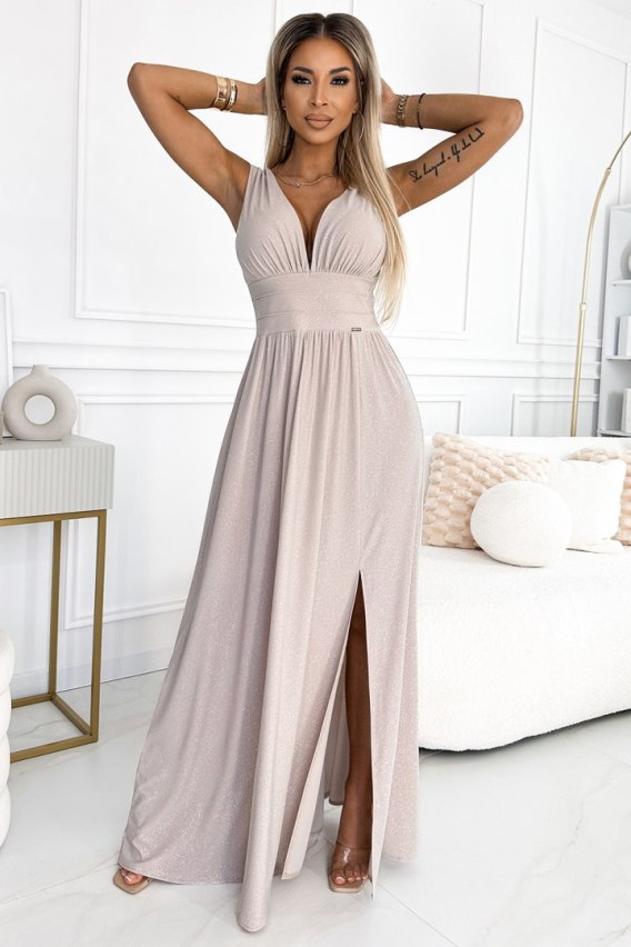490-2 SUSAN Długa brokatowa suknia z dekoltem i przeszyciami w pasie - BEŻOWA