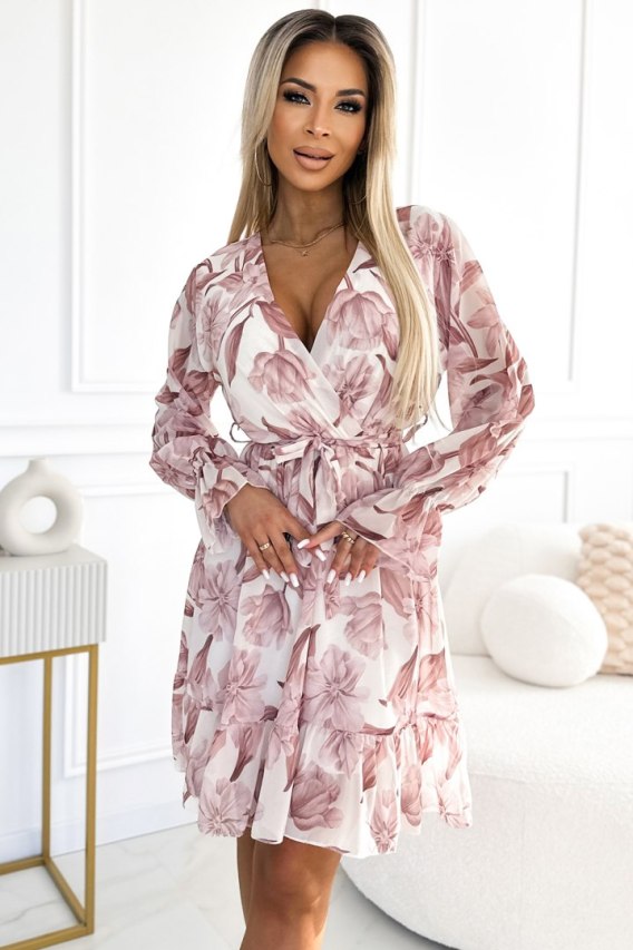 • 514-1 Szyfonowa sukienka z dekoltem, falbanką i paskiem - BEŻOWE KWIATY