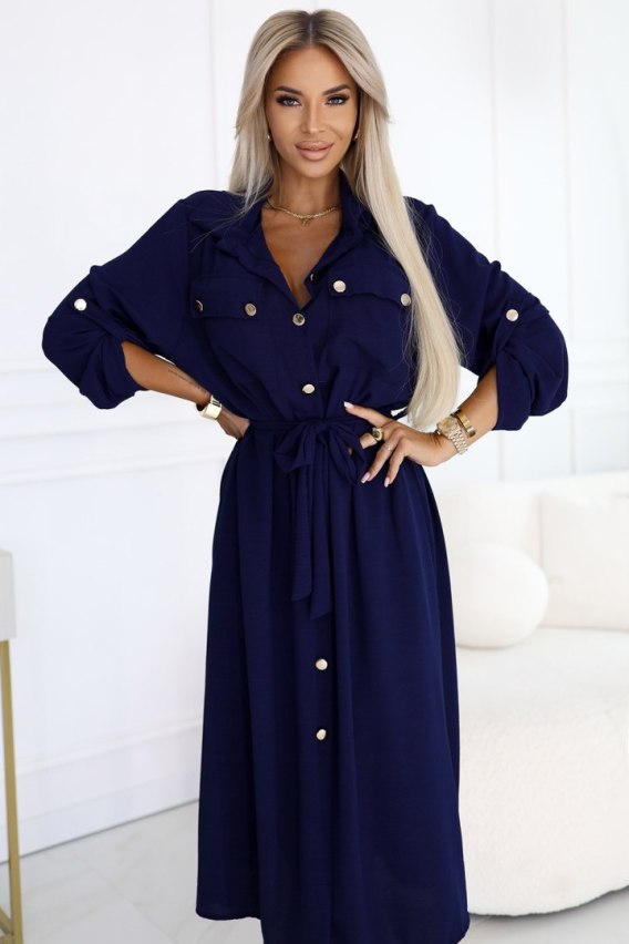 Granatowa szmizjerka z paskiem i złotymi guzikami. Stylowa sukienka koszulowa marki Numoco Basic - idealna na co dzień i do pracy. Produkcja europejska.