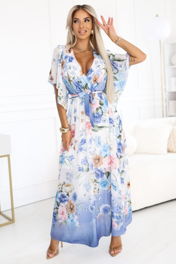 603-3 Zwiewna maxi sukienka z kopertowym dekoltem i kwiecistym wzorem - BŁĘKITNE RÓŻE