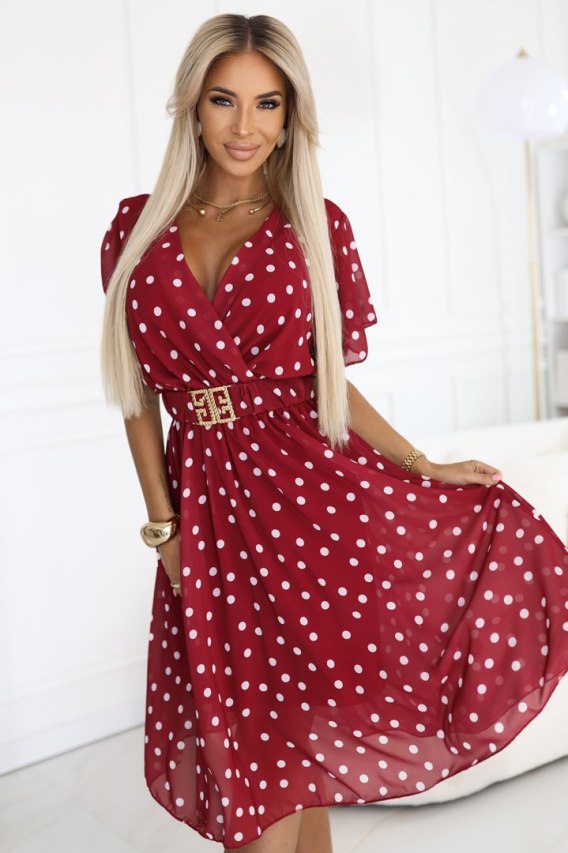604-1 Zmysłowa sukienka w białe groszki z kopertowym dekoltem i ozdobnym paskiem - bordowa