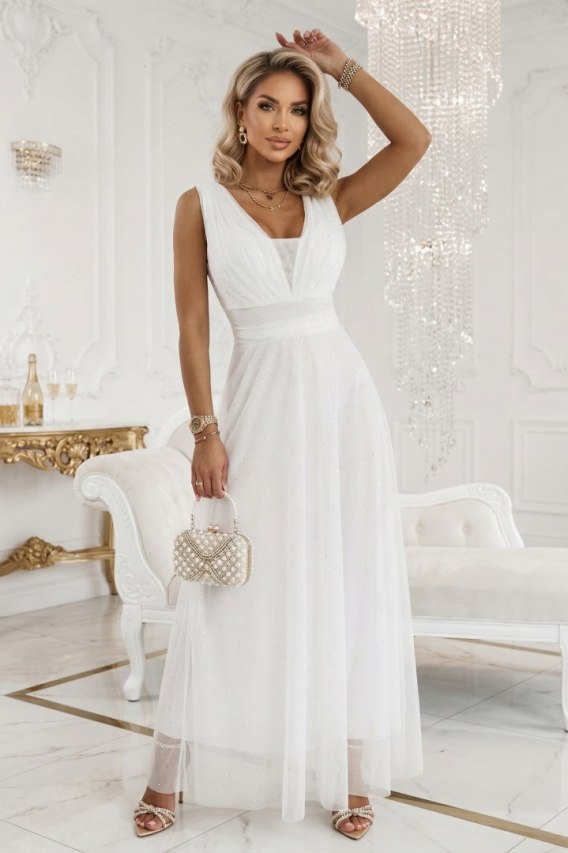 • 637-8 Długa sukienka maxi z brokatowym akcentem i głębokim dekoltem - ecru