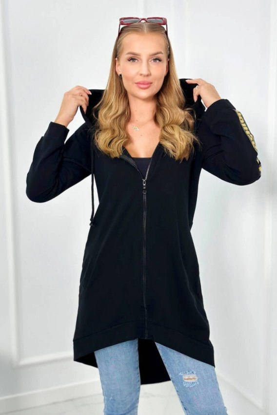Prezentujemy Państwu wygodną długą bluzę z kapturem. Bluza posiada zapięcie na suwak oraz dodatkowo suwak z tyłu. Kieszenie z boku oraz dwie ozdobe z tyłu. Bluza posiada naszyte taśmy z napisem fashion. Bluza wykonana jest z wysokiej jakości materiału. Rozmiar jest uniwersalny i będzie odpowiedni dla Pań noszących rozmiar S, M lub L.