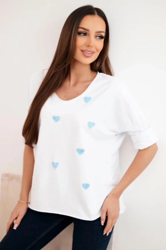 Bluzka damska bawełniana z długim rękawem i serduszkami biały+niebieski