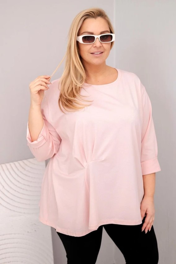 Bluzka damska plus size z bawełną z długim rękawem i marszczeniem pudrowy róż