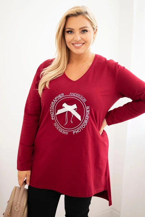 • Bluzka damska z dłuższym tyłem i nadrukiem bordowa