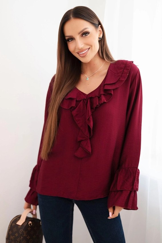 Bluzka damska z wiskozy z falbanami i długim rękawem bordowa