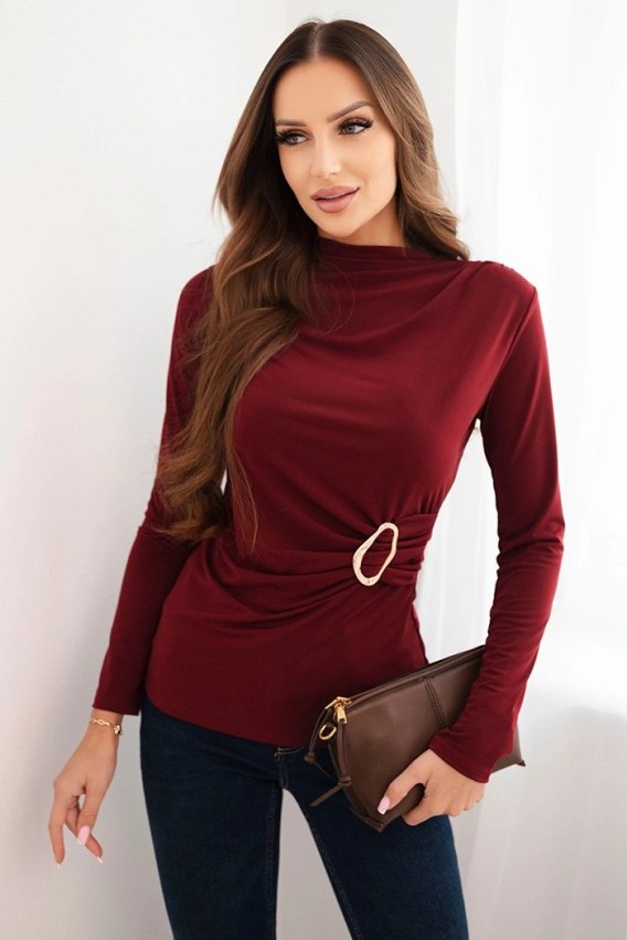 Bluzka damska z wiskozy z marszczeniem i ozdobną klamrą bordowa