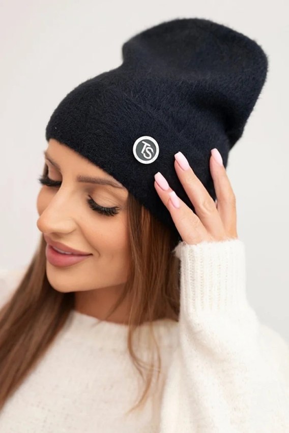 Czapka damska miękka z puszystej dzianiny z ozdobną blaszką czarna