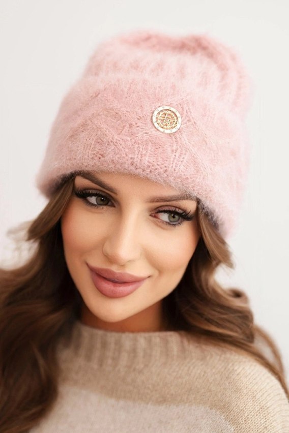 • Czapka damska prążkowana z wiskozy puszysta z ozdobnym metalowym guzikiem pudrowy róż
