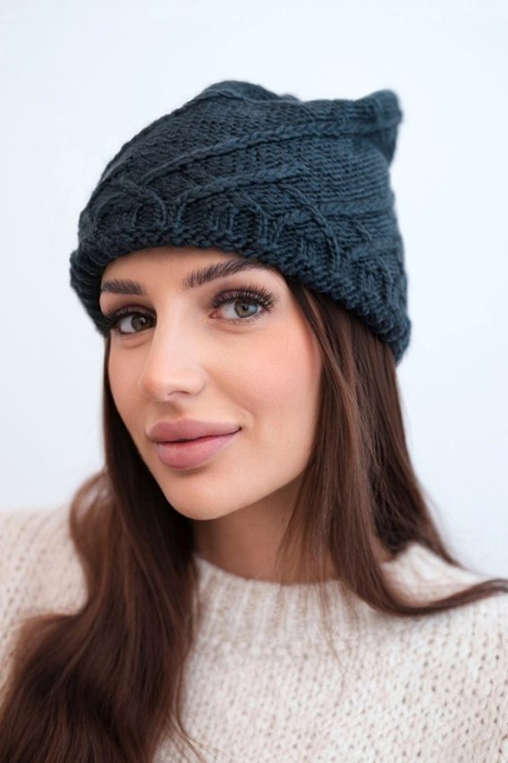 Czapka damska wełniana zimowa z ozdobnym splotem K403 grafitowa
