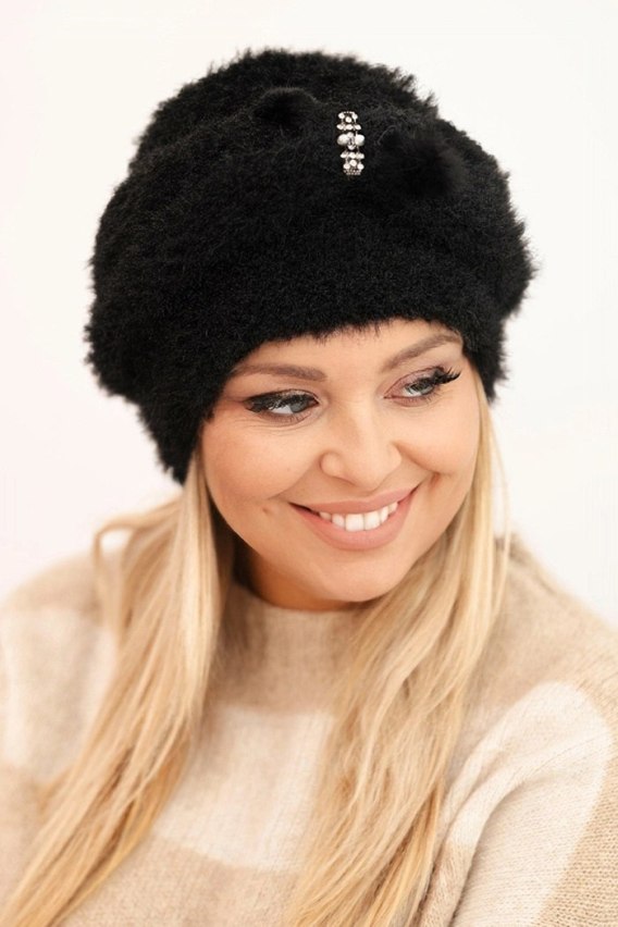 Czapka ozdobiona została eleganckim elementem dekoracyjnym z błyszczącymi kamyczkami oraz delikatnymi, futrzanymi kuleczkami, które dodają jej uroku i modowego charakteru.