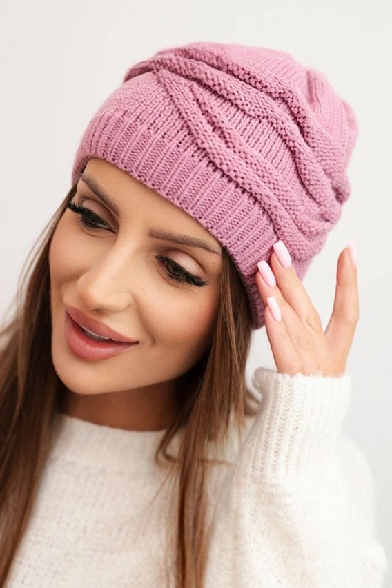 Czapka damska zimowa wełniana z ozdobnym splotem K429 jasno fioletowa