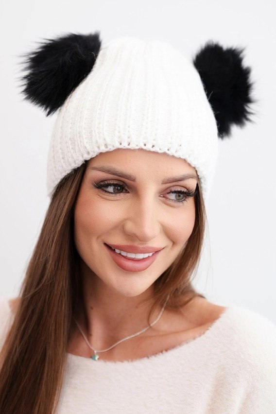 Urocza czapka damska z dwoma pomponami przypominającymi uszka misia to idealny wybór na chłodne dni! Wykonana z miękkiej, elastycznej dzianiny, świetnie dopasowuje się do głowy i zapewnia komfort noszenia. Model wyróżnia się zabawnym designem i starannym wykonaniem.