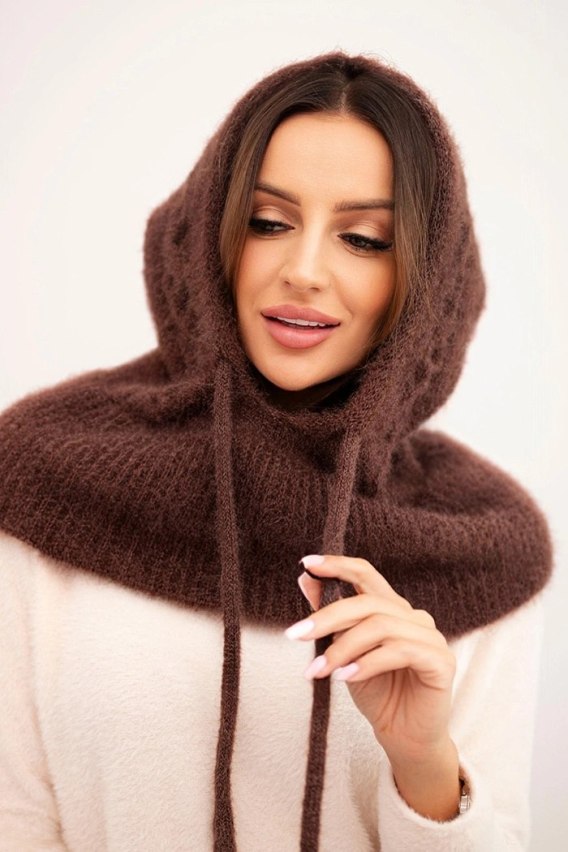 Czapka kaptur damski z wiązaniem i warkoczowym splotem brązowa