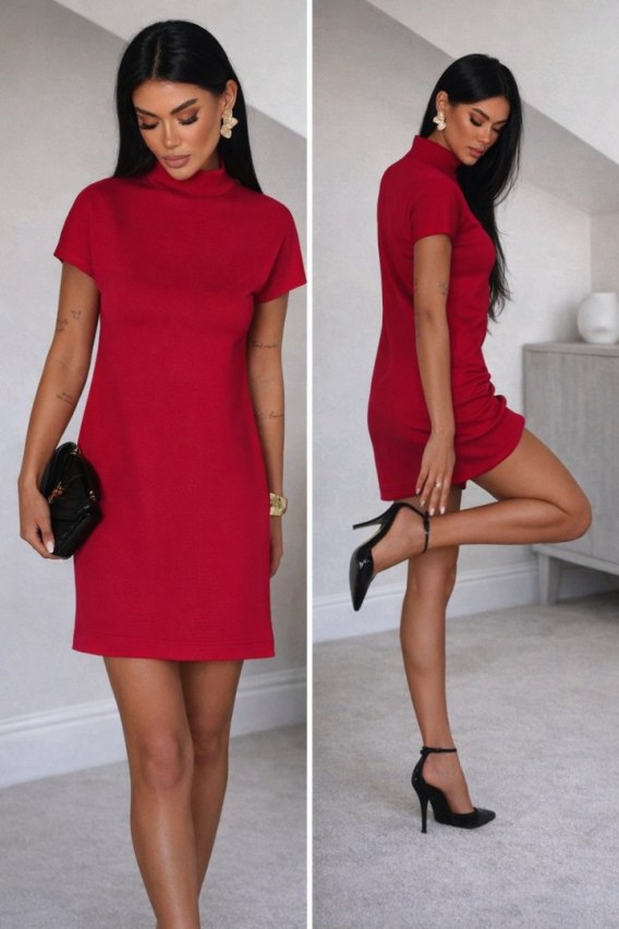 • Czerwona sukienka dzianinowa z golfem KLER