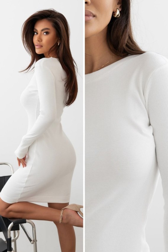 NOLIA to dopasowana sukienka przed kolano uszyta z elastycznej, miękkiej dzianiny w prążek.