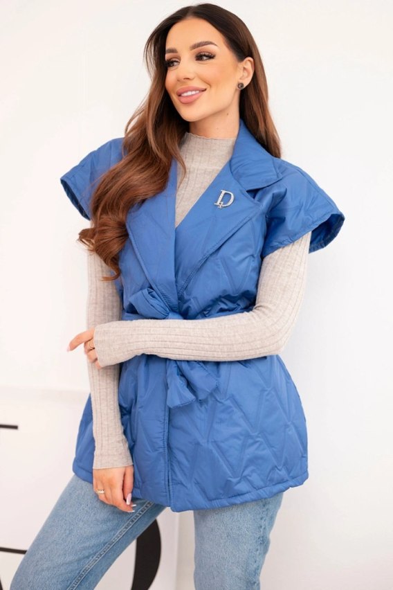 Kamizelka damska pikowana z paskiem i szerokim kołnierzem chabrowa