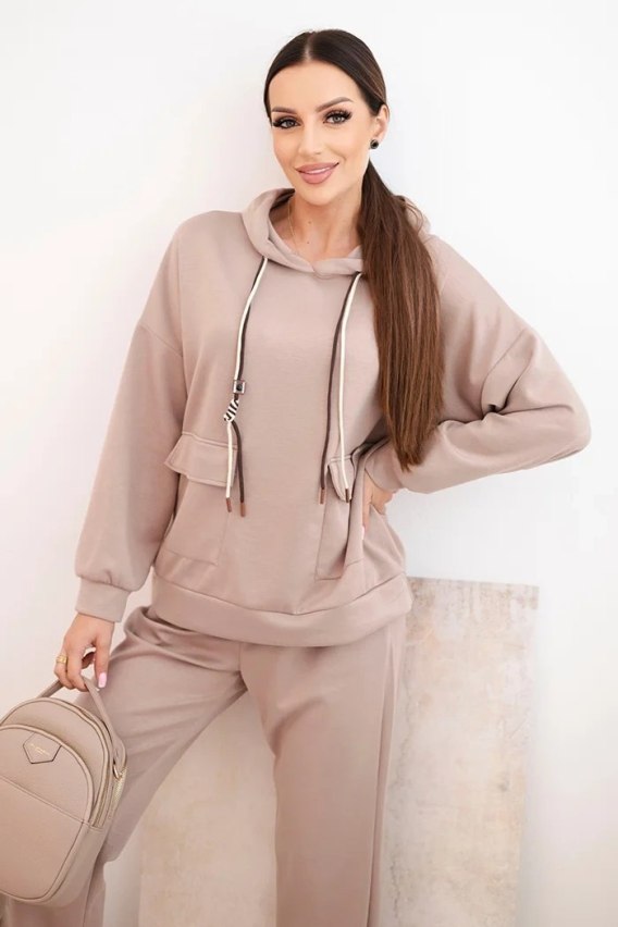 Komplet damska masełkowy bluza z kapturem i spodniami z paskiem ciemny beżowy