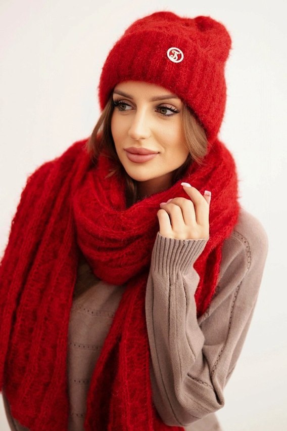 • Komplet damski czapka i szalik prążkowany z ozdobą czerwony