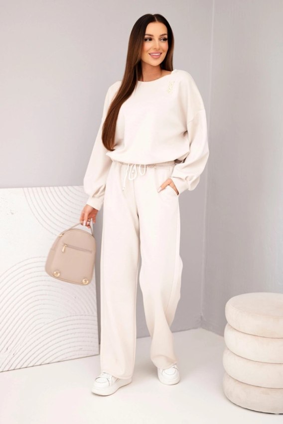 Komplet damski masełko bluza z broszką i spodnie z prostą nogawką beżowy