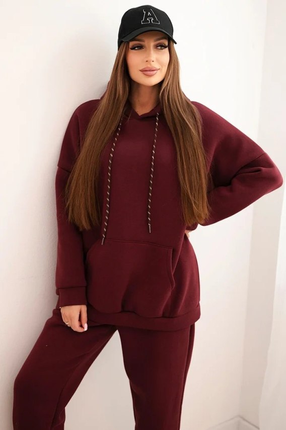 Komplet dresowy damski ocieplany z bawełny i z kapturem bordowy