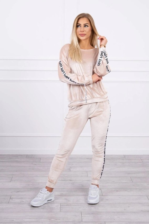 Prezentujemy Państwu komplet bluzy i spodni. Komplet wykonany z weluru. Bluza posiada taśmy z napisem Love. Spodnie z kieszeniami oraz wiązanie w pasie. Bardzo modny i stylowy komplet. Komplet wykonany jest z wysokiej jakości materiału. Rozmiar jest uniwersalny i będzie odpowiedni dla Pań w rozmiarze S, M lub L.
