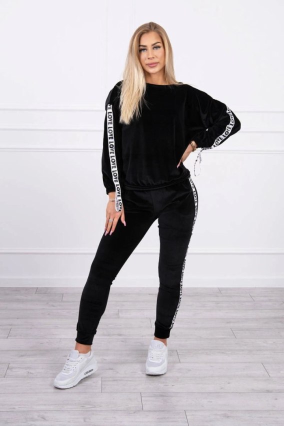 Prezentujemy Państwu komplet bluzy i spodni. Komplet wykonany z weluru. Bluza posiada taśmy z napisem Love. Spodnie z kieszeniami oraz wiązanie w pasie. Bardzo modny i stylowy komplet. Komplet wykonany jest z wysokiej jakości materiału. Rozmiar jest uniwersalny i będzie odpowiedni dla Pań w rozmiarze S, M lub L.