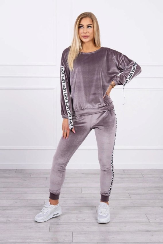 Prezentujemy Państwu komplet bluzy i spodni. Komplet wykonany z weluru. Bluza posiada taśmy z napisem Love. Spodnie z kieszeniami oraz wiązanie w pasie. Bardzo modny i stylowy komplet. Komplet wykonany jest z wysokiej jakości materiału. Rozmiar jest uniwersalny i będzie odpowiedni dla Pań w rozmiarze S, M lub L.
