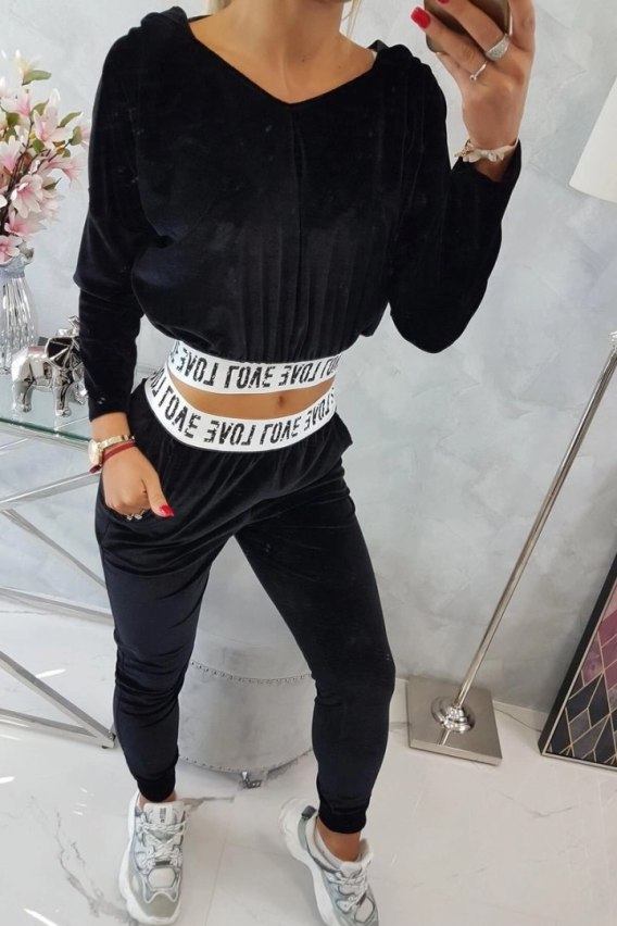 Prezentujemy Państwu komplet bluzy i spodni. Komplet wykonany z weluru. Bluza z kapturem i dekoltem w kształcie litery V. U dołu bluzy znajduje się wszyta taśma z napisem. Spodnie z kieszeniami oraz taśmą w pasie. Komplet wykonany jest z wysokiej jakości materiału. Rozmiar jest uniwersalny i będzie odpowiedni dla Pań w rozmiarze S, M lub L.