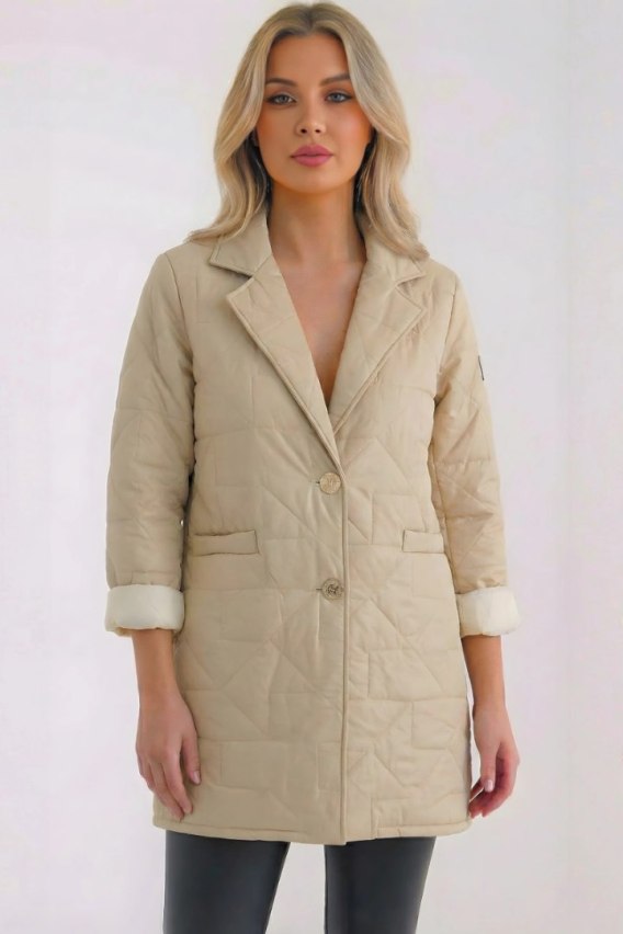 • Kurtka damska Plus Size pikowana z ozdobnymi guzikami i kołnierzem ciemno beżowa