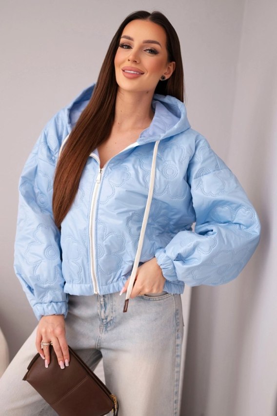 Kurtka damska pikowana z kapturem i ozdobnym tłoczeniem kwiatowym niebieska