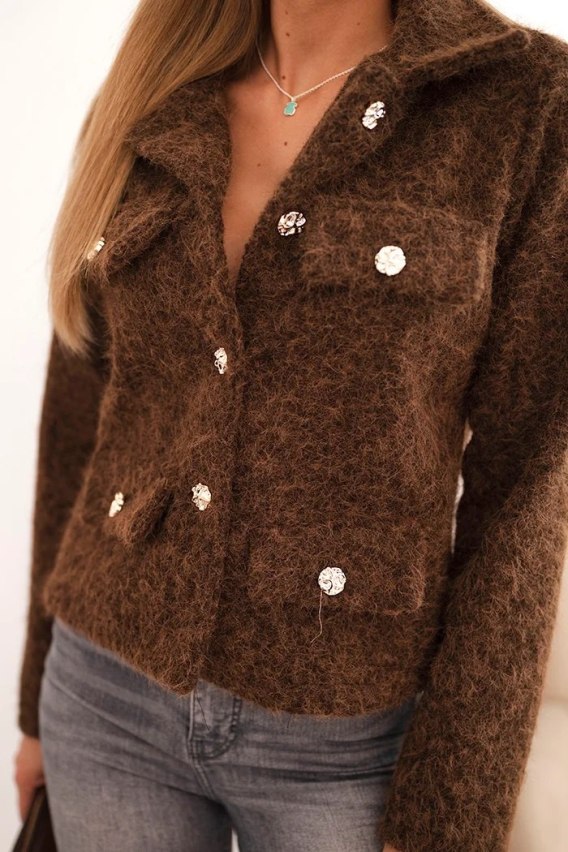 Kurtka damska z wełną o puszystej strukturze i ozdobnymi guzikami mocca