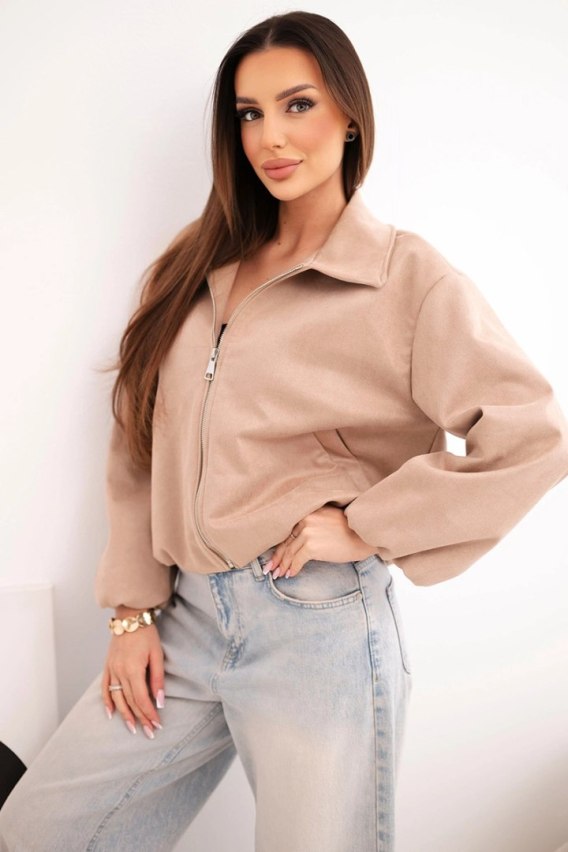 • Kurtka damska z zamkiem i bufiastym rękawem camelowa