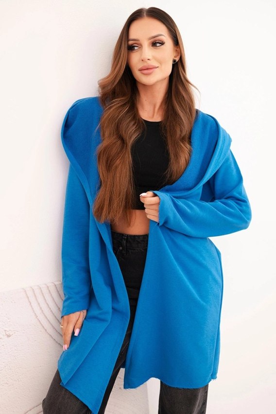 Narzutka damska z bawełny z kapturem i wydłużonym przodem chabrowa