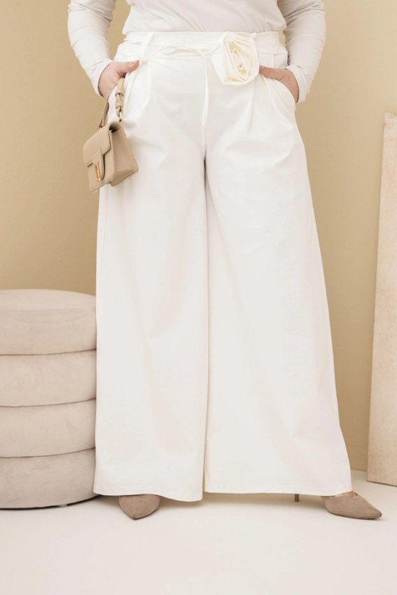 Spodnie damskie Plus Size z szeroką nogawką i ozdobnym kwiatem w talii ecru