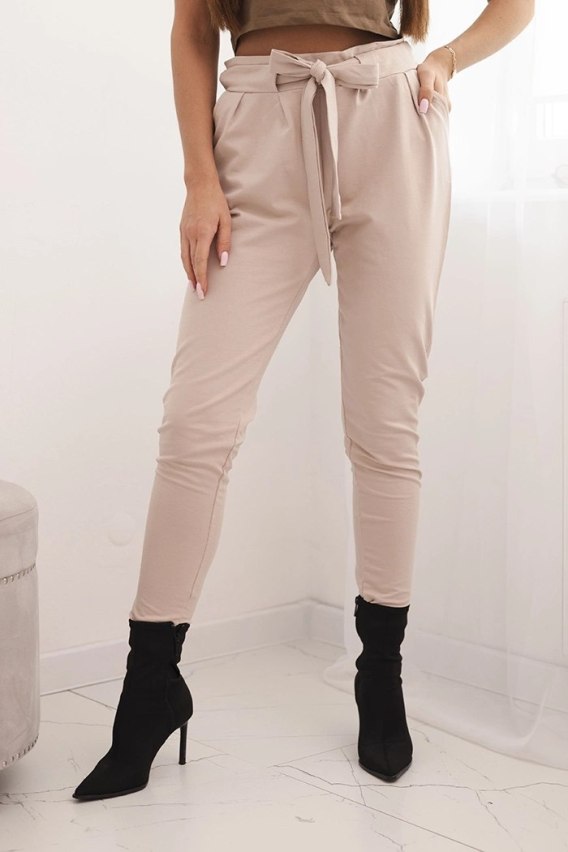 Spodnie damskie bawełniane z wiązaniem w pasie i zwężaną nogawką beżowe