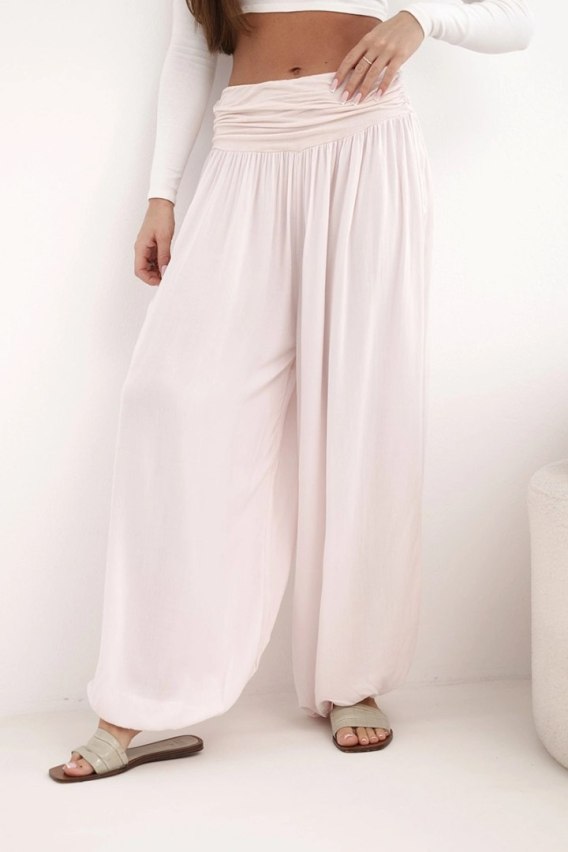 Spodnie damskie wiskozowe z szeroką nogawką i marszczeniami pudrowy róż