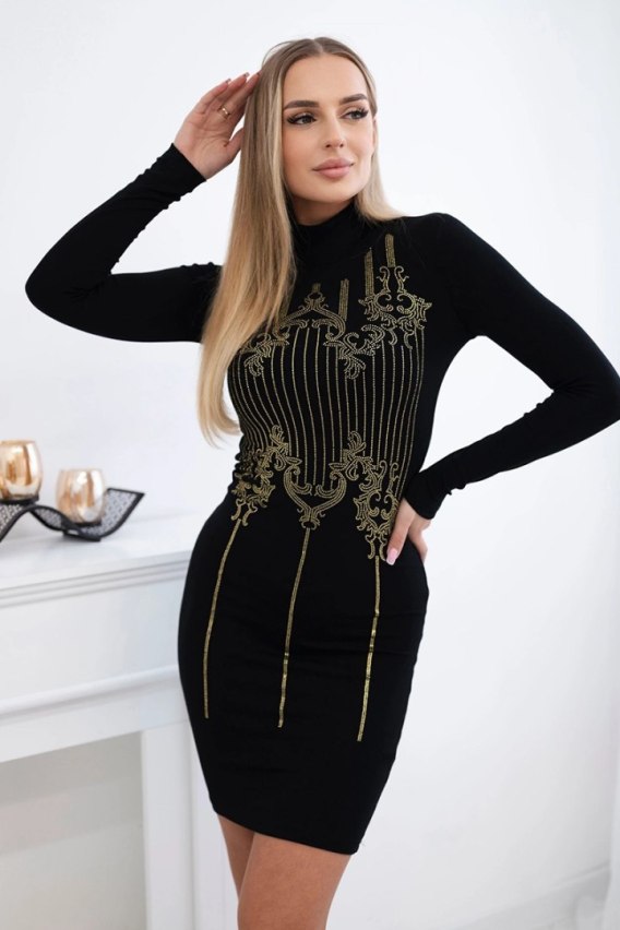 Sukienka dzianinowa ze złotym wzorem z cyrkonii czarna