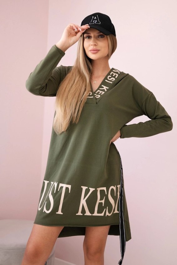 Prezentujemy Państwu wygodną sukienkę. Sukienka z kapturem oraz nadrukiem. Nadruk z przodu oraz na kapturze, Sukienka posiada dłuższy tył. Na bokach ozdobne taśmy. Sukienka wykonana jest z wysokiej jakości materiału. Rozmiar jest uniwersalny i będzie odpowiedni dla Pań noszących rozmiar S, M lub L.